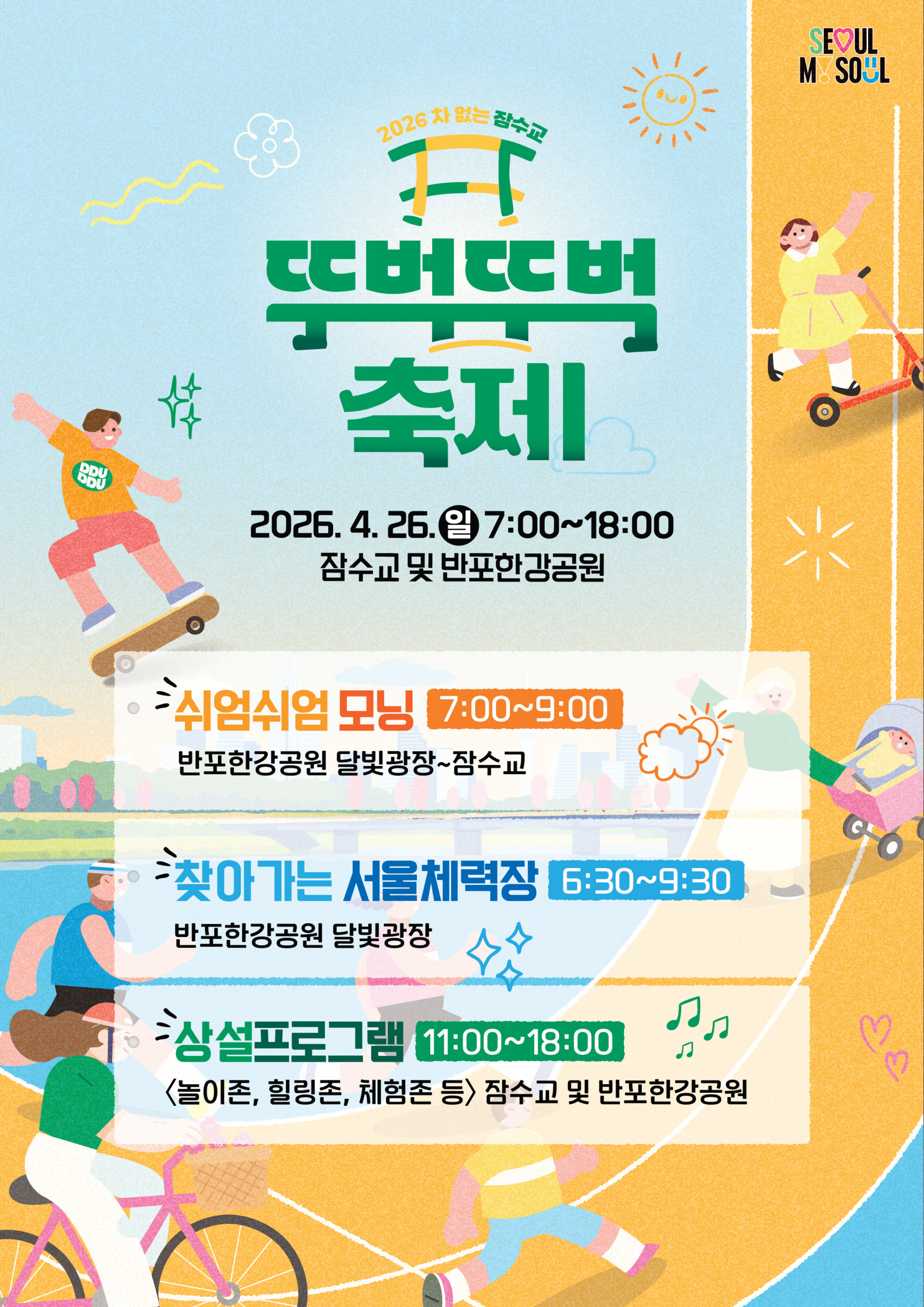 2026.03.042026 [쉬엄쉬엄 모닝] 개최 안내가. 사업명 : 쉬엄쉬엄 모닝 나. 기 간 : 2026. 3. 14.(토), 3.22.(일), 3.29.(일) 07:00 ~ 09:00 다. 장 소 : 여의도 공원 문화의마당 (집결) * 코스: 여의대로 ~ 마포대교(반환) 라.참가인원: 7천명 마. 내 용 : 자유 운동(걷기, 달리기, 자전거, 유아차 등) 바. 문 의 : 쉬엄쉬엄 모닝 운영사무국 (☎02-6958-8585) 사. 신청방법: 홈페이지를 통한 신청 ▶ https://www.seoulsports.or.kr/user/citizenAction/userCitizenProgramList.do?citizenParam=mr 마. 홍보자료:▶ https://www.youtube.com/shorts/jMgPOhZAMa4